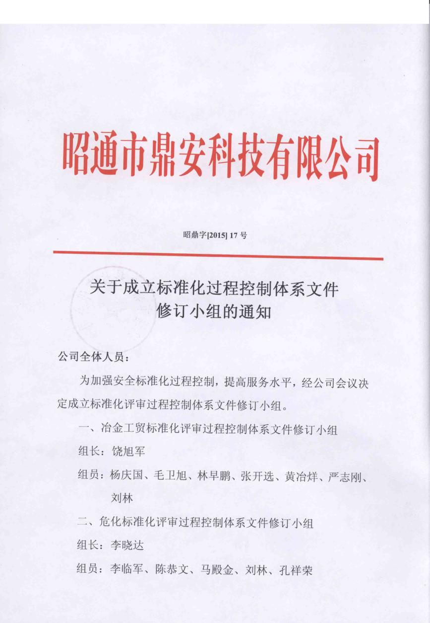 關于成立標準化過程控制體系文件修訂小組的通知